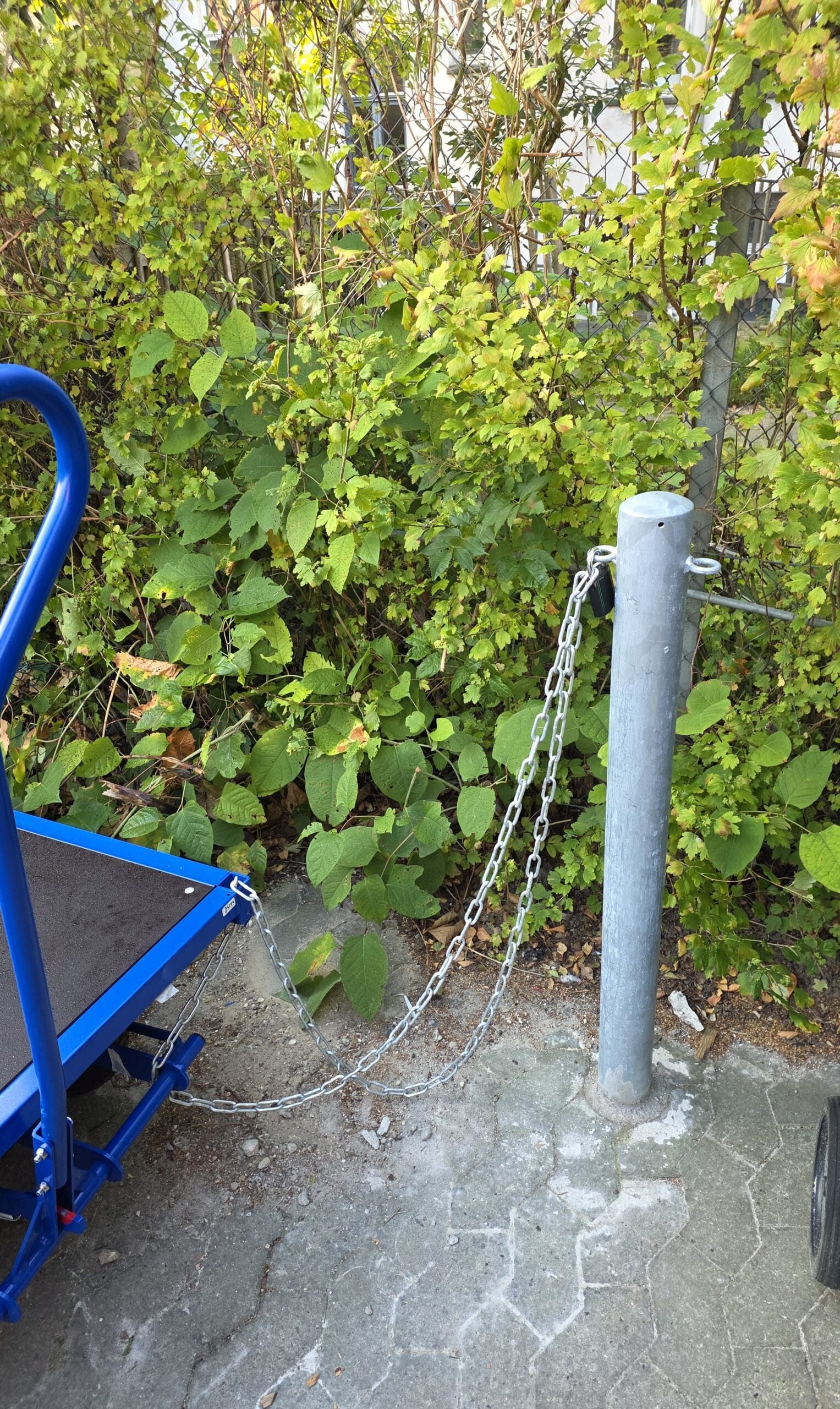 Trækvognen er låst fast til en nedstøbt jernstolpe inde på storskraldsområdet.