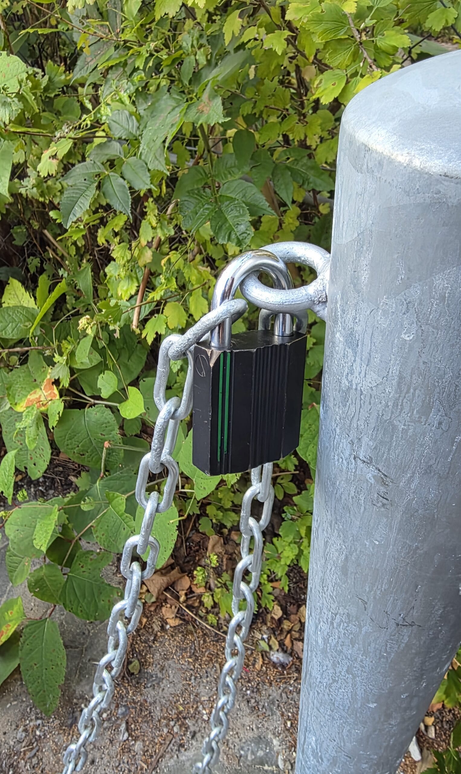 Vognen er sikret med en kæde og hængelås. Nøglen til denne hængelås er den samme, som du bruger til storskraldsskuret og cykelskurene. Praktisk, ikke?